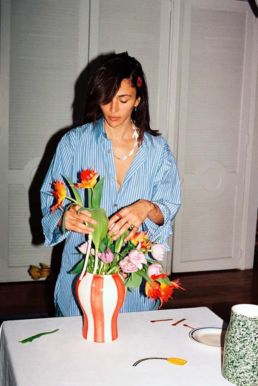 En del af et designsamarbejde mellem HAY og kunstneren Laila Gohar. Sobremesa Stripe Vase en dekorativ vase designet til at tilføje stemning til enhver borddækning. Håndmalet i stentøj med et farverigt stribet mønster, der giver hver kande en unik kvalitet. Fås i forskellige farver. Mål: Small: Ø: 19 cm, H: 22 cm Large: Ø: 19 cm, H: 25 cm
