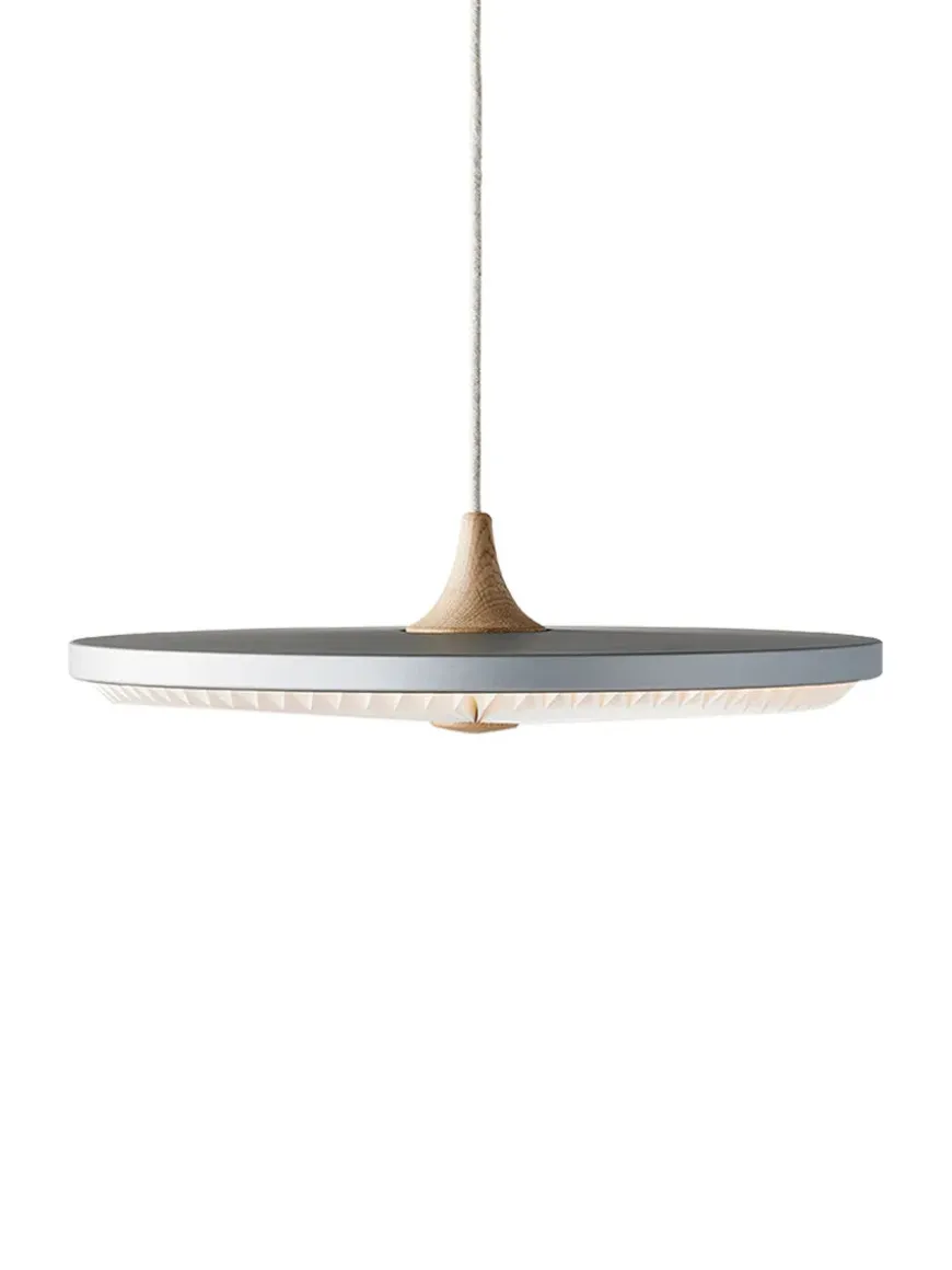 Soleil betyder sol på fransk, og lampen har samme fine egenskaber med en lysspredning som en strålende sol – der spreder lyset fra sit centrum. Le Klint Soleil pendlens slanke design gør den meget anvendelig til at hænge over spisebordet, i restauranten eller mødelokalet. Lampen er uden lysdæmper, men kan benyttes med Casambi lysdæmper, hvor man kan styre lysstyrken via en gratis app/bluetooth på sin mobiltelefon. Soleil kan ikke benyttes sammen med andre allerede installerede lysdæmper-funktioner i boligen. Mål: Diameter: Ø 50 cm. Højde: 6 cm. Farve: Silver Cloud Træsort: Lys eg Skærm: Standard (plast) Model: 198 Designet af: Philip Bro Ludvigsen