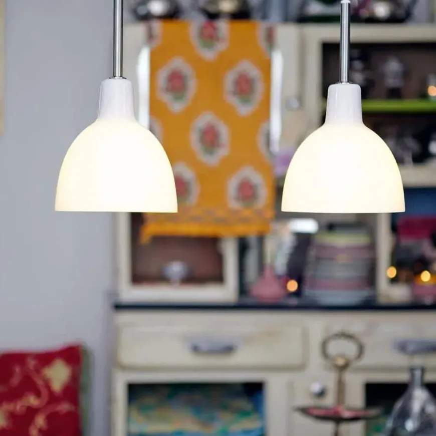 Materiale: Mundblæst hvidt opalt glas, pendelrør i børstet rustfrit stål.