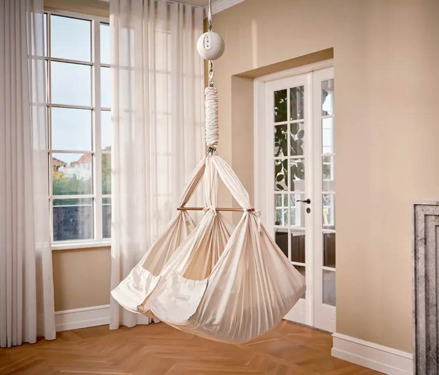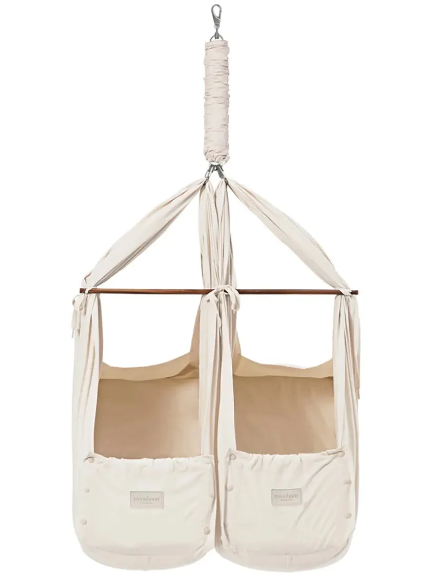 Tvillingeslyngevuggen passer ind i alle hjem med et stilrent og æstetisk skandinavisk design. Den kommer i det ikoniske Moonboon-design i 100% økologisk bomuld med allergivenlige og silkebløde kapokmadrasser. Tvillingeslyngevuggen er i den afslappende og neutrale farve nature.